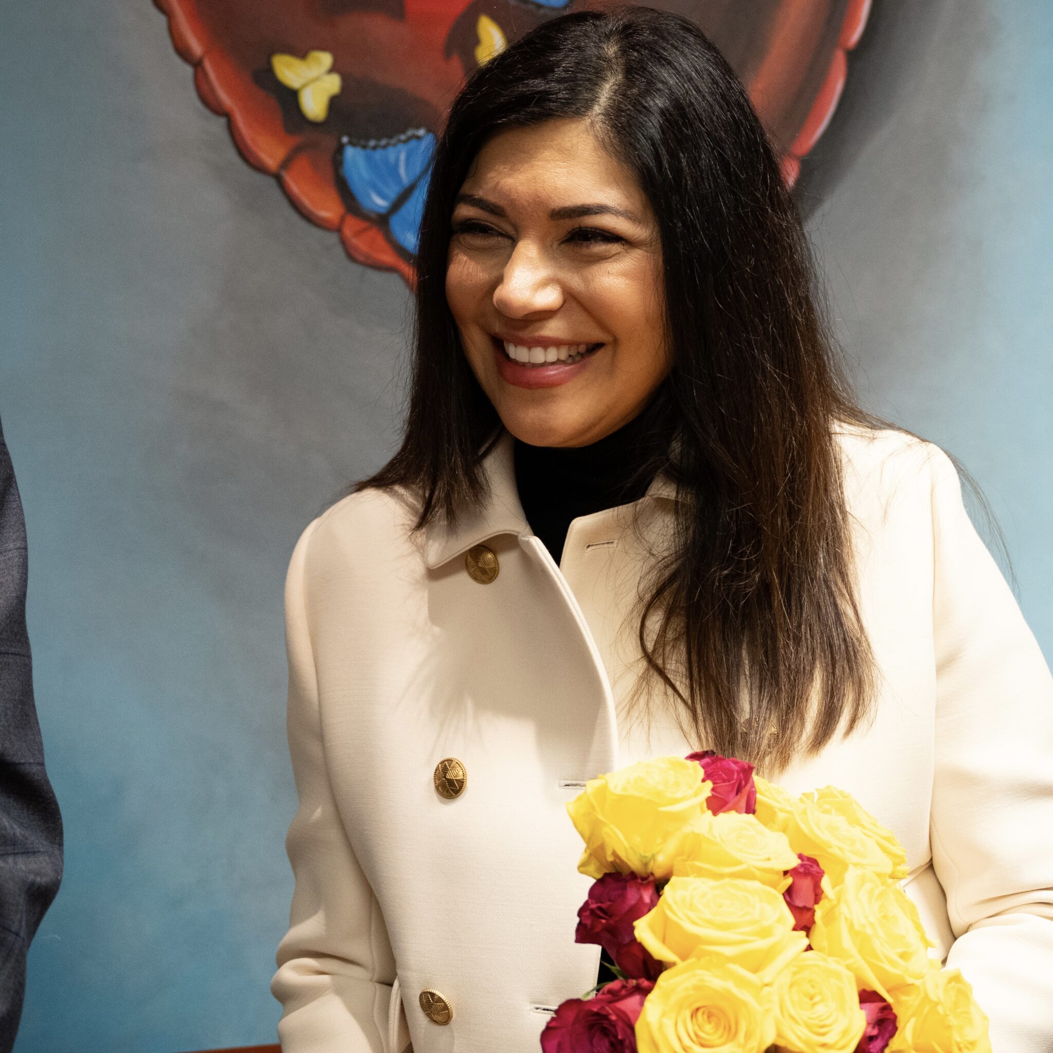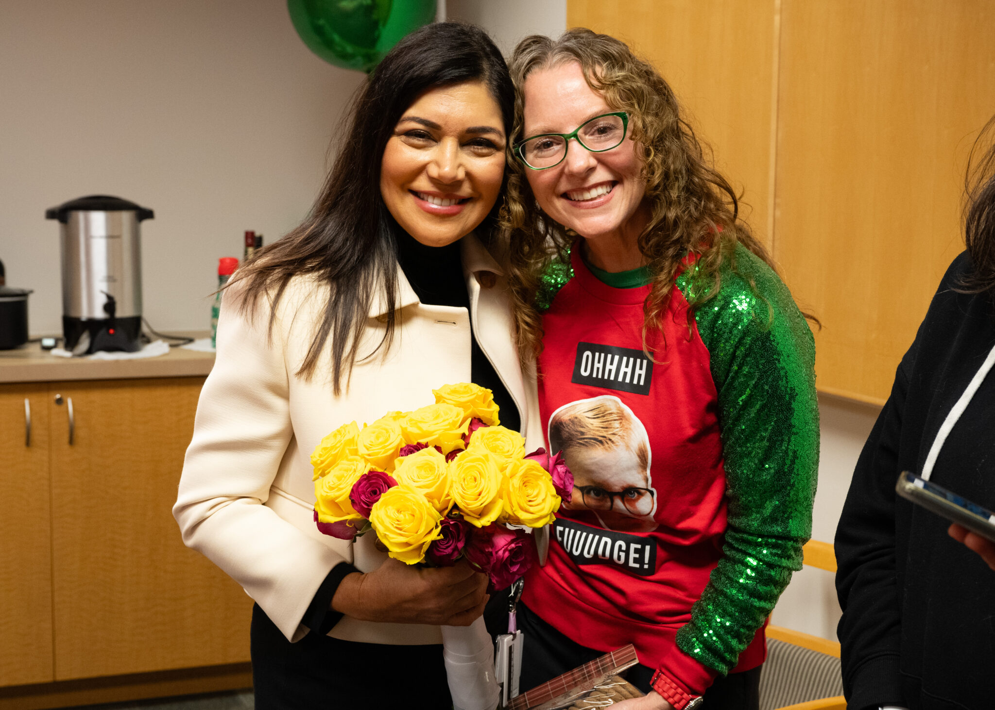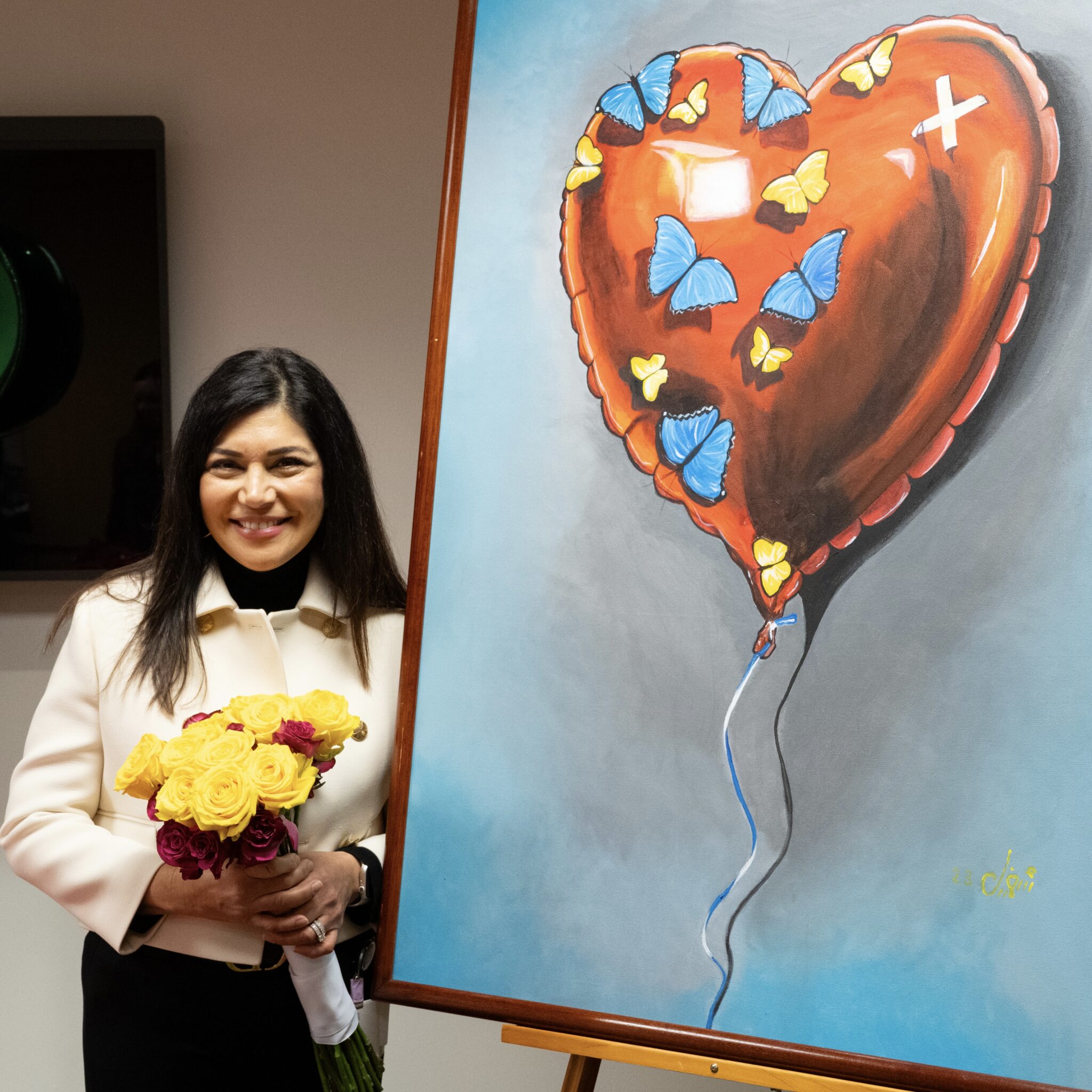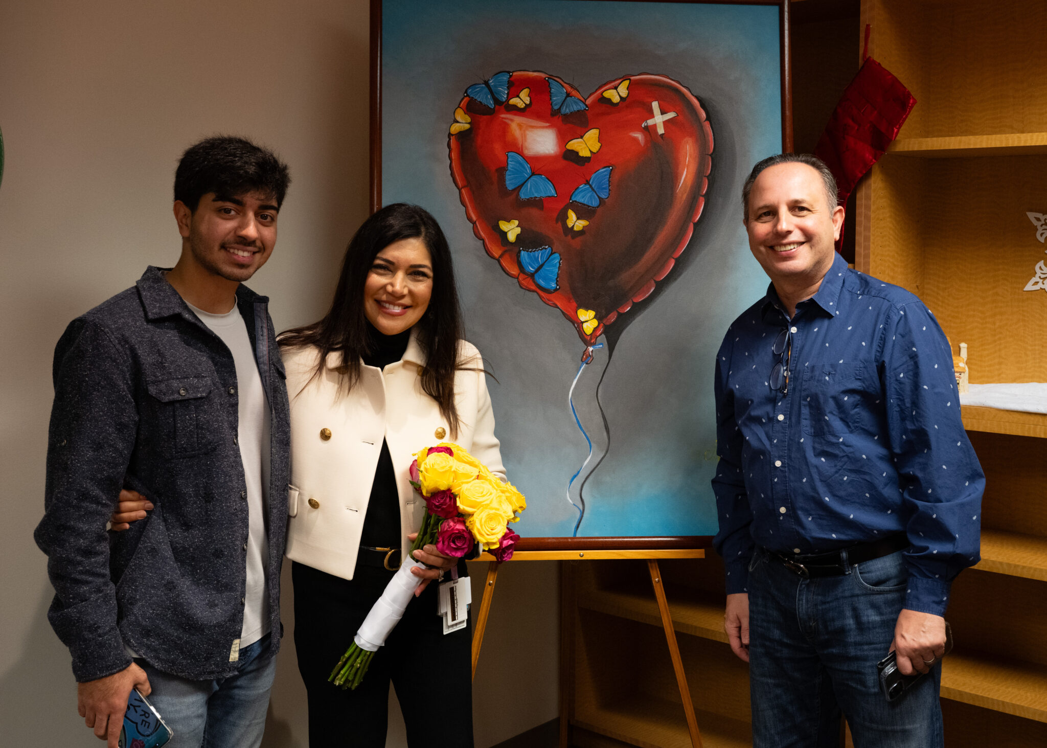While traveling in New York and throughout Europe, Shahrzad was inspired by different artists using balloons and butterflies in their work. “I included butterflies in the piece because they represent the transformation a patient goes through during their care journey, and the balloon against a beautiful blue sky symbolizes hope,” she explained to the research, education, and patient-care teams who attended the unveiling.